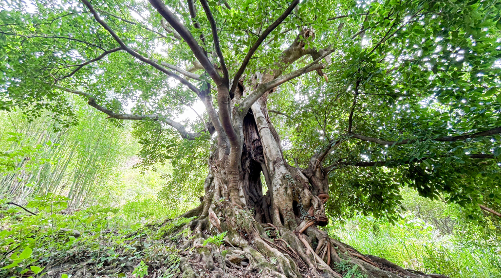 古树资源也是海花沟的一大特色。项目范围内有近200棵数百上千年的古树沿主要道路呈带状分布,专家一行参观的是园区的“千手观音子母树”和“七星古树”。子母树为同根而生的双生树,母树根系在十余米外再次萌芽,生长为子树。二者根系相连、枝叶相接、风姿相似,因母树枝干如手臂向四周伸展,神似千手观音,故被当地村民称为“千手观音子母树”。“七星古树”因生长方位分别与北斗七星——天枢、天璇、天玑、天权、玉衡、开阳、瑶光对应,故此得名。每年农历三月三,七里八乡的村民在此举行“斗菜节”,祭祀树神祈福新年。